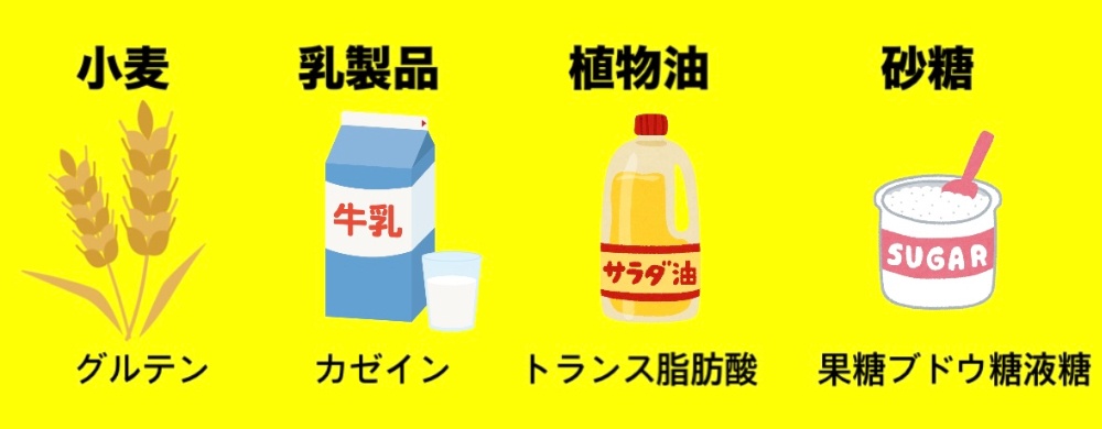 小麦の主成分であるグルテン(小麦タンパク質)をうまく消化できず、自己免疫疾患のような拒絶反応が起こり、腸粘膜を荒らし、自然免疫を低下させます。