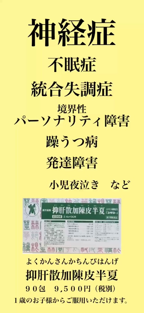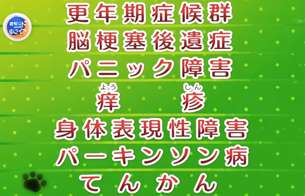 神経症、不眠症、小児夜泣き、小児疳症(神経過敏)、更年期障害、血の道症、歯ぎしり