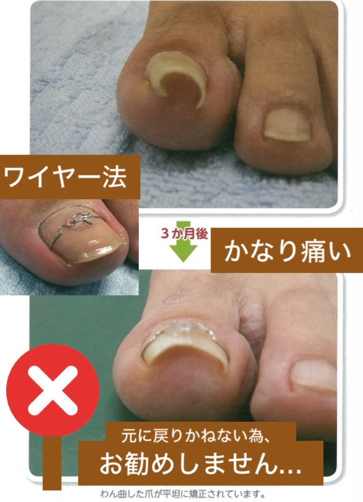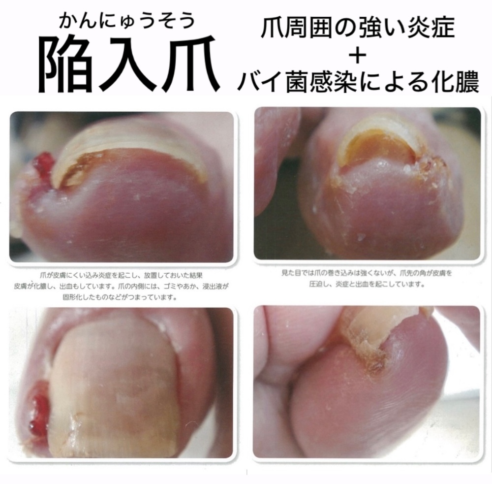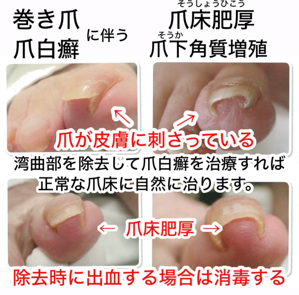 厚みのある爪を平らに削り、新しく生える爪に水虫を感染させないように薬を毎日塗って真っ直ぐ伸ばします。