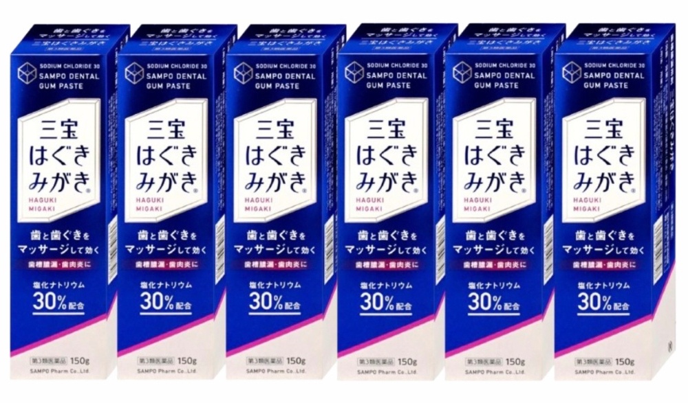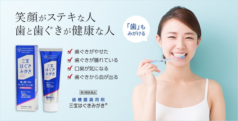 「三宝はぐきみがき」は塩化ナトリウム30%に3種類の殺菌・局所麻酔剤等を配合した医薬品の歯磨き粉です。これらの有効成分の働きにより、歯茎の血行を良くし、強く引き締め、炎症を抑え、歯周病(歯肉炎・歯槽膿漏)の症状を緩和します。使用している塩化ナトリウムは微細塩になっているので、歯茎を傷つけません。